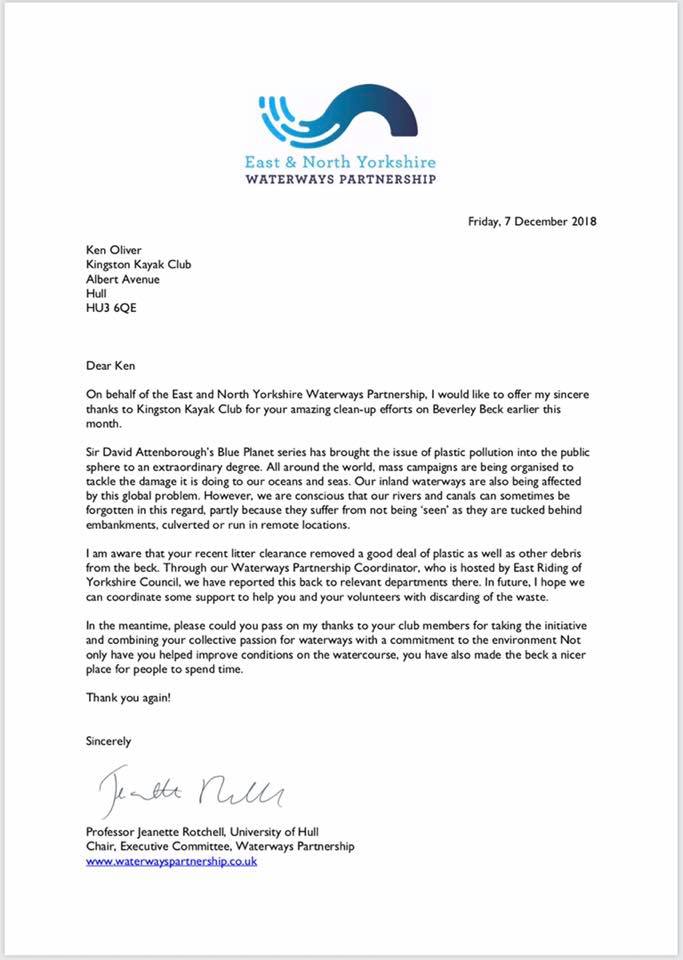 KKC paddlers recognised for cleanup 11th December 2018 Uncategorized Kingston Kayak Club’s tidy up of Beverley Beck cleanup got mentioned in the British Canoeing News this week and we also received thanks from the East & North Yorkshire Waterways Partnership.